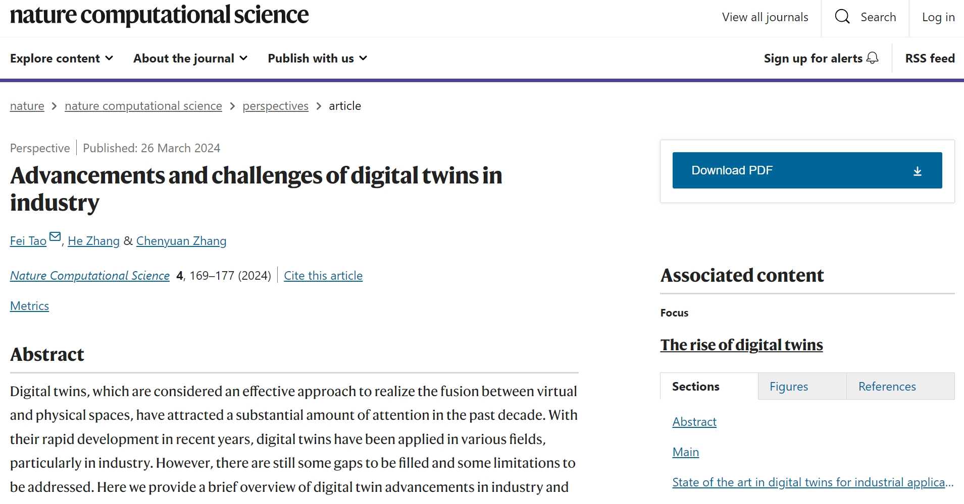 3月27日,陶飞教授团队受邀在《Nature Computational Science》杂志发表了工业领域数字孪生的综述与最新视角长文文章:《Advancements and challenges of digital twins in industry》。该文章对国内外数字孪生在工业领域的最新研究与应用进展进行了总结,深度剖析了数字孪生理论研究与工业实践过程中存在的问题及面临的挑战,并指明了未来发展方向。陶飞教授、张贺博士后、博士生张辰源为该文作者,陶飞教授为通讯作者,永利国际
