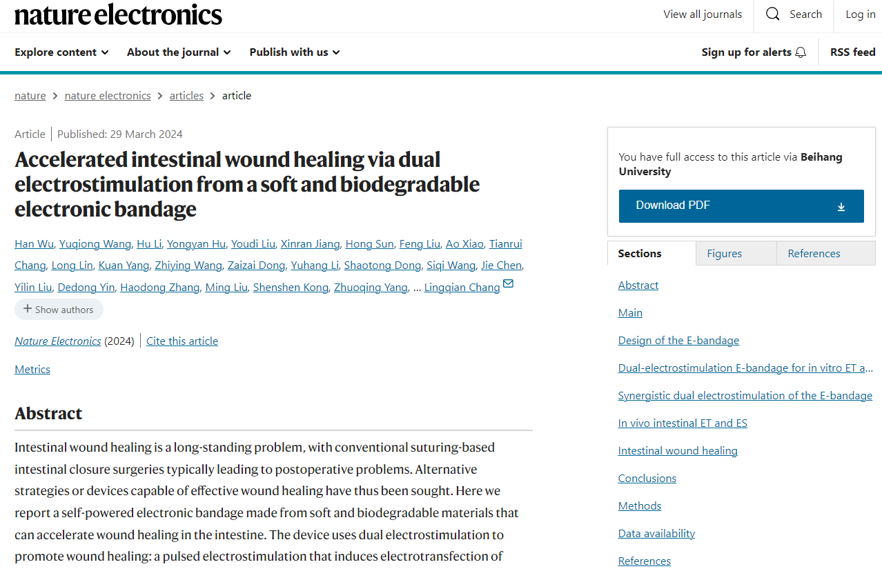 3月29日,常凌乾教授团队报道了一种柔性、可生物降解、自供电电子绷带,能够提供双模式电刺激,协同加速和改善肠道伤口愈合,并显著减少了术后并发症。相关成果以“Accelerated intestinal wound healing via dual electrostimulation from a soft and biodegradable electronic bandage”为题,发表在《Nature Electronics》上。北航生物与医学工程永利国际