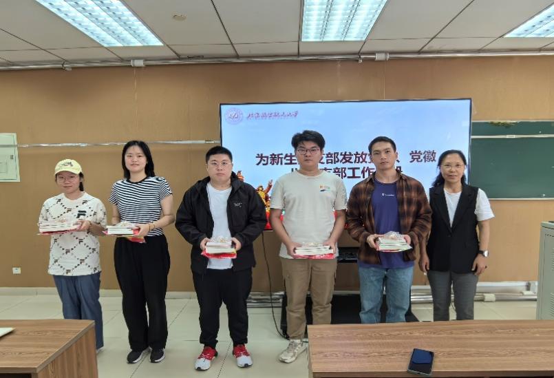 新学期工作部署结束后,王书记为新生党支部发放党旗、党徽及党支部工作手册。她亲手将党旗和党徽交给了本硕博新生党支部书记,这一仪式不仅是对新生力量的热烈欢迎,更是对全体党支部书记的激励和鞭策。