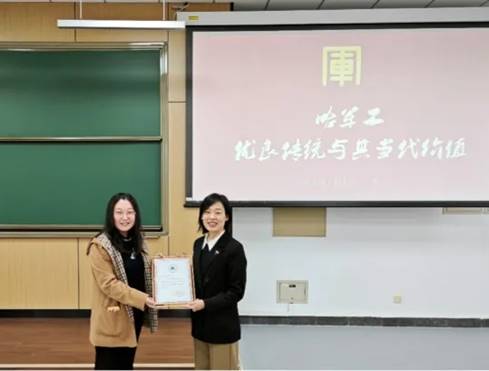 分团委书记乔娇老师向李宏老师颁发了“驭远大讲堂”授课证书。