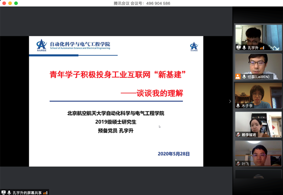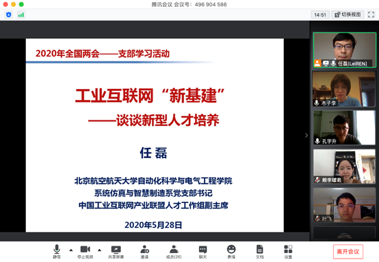 系统仿真与智慧制造系党支部与系内25名研究生进行了在线研讨。孔宇升同学作为预备党员,同时作为上述两会特别节目的青年学生代表,以《青年学子积极投身工业互联网“新基建”》为主题发表了见解,提出根据两会会议精神,作为青年学子应立足北航特色、顺应国家战略发展需求,力争在其所从事的工业互联网研究方向做出创新性贡献,成为国家未来需要的栋梁之才。