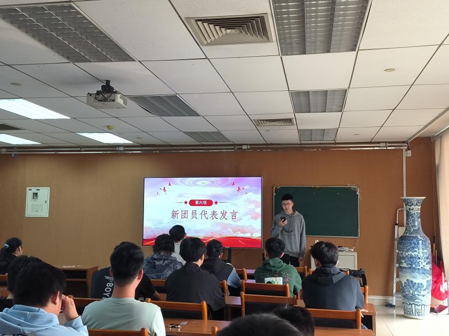 分团委,对新发展团员们表示祝贺,鼓励他们要坚守初心,坚守理想信念,时刻保持勤奋向上的精神。他强调青年人是国家和社会的未来,希望学生们能够积极参与团队活动,发扬团组织的精神,为校园发展助力。他指出,要不断提高自身素质,保持积极向上的心态,在共青团这个大家庭中找到自己的位置,展现自己的价值。